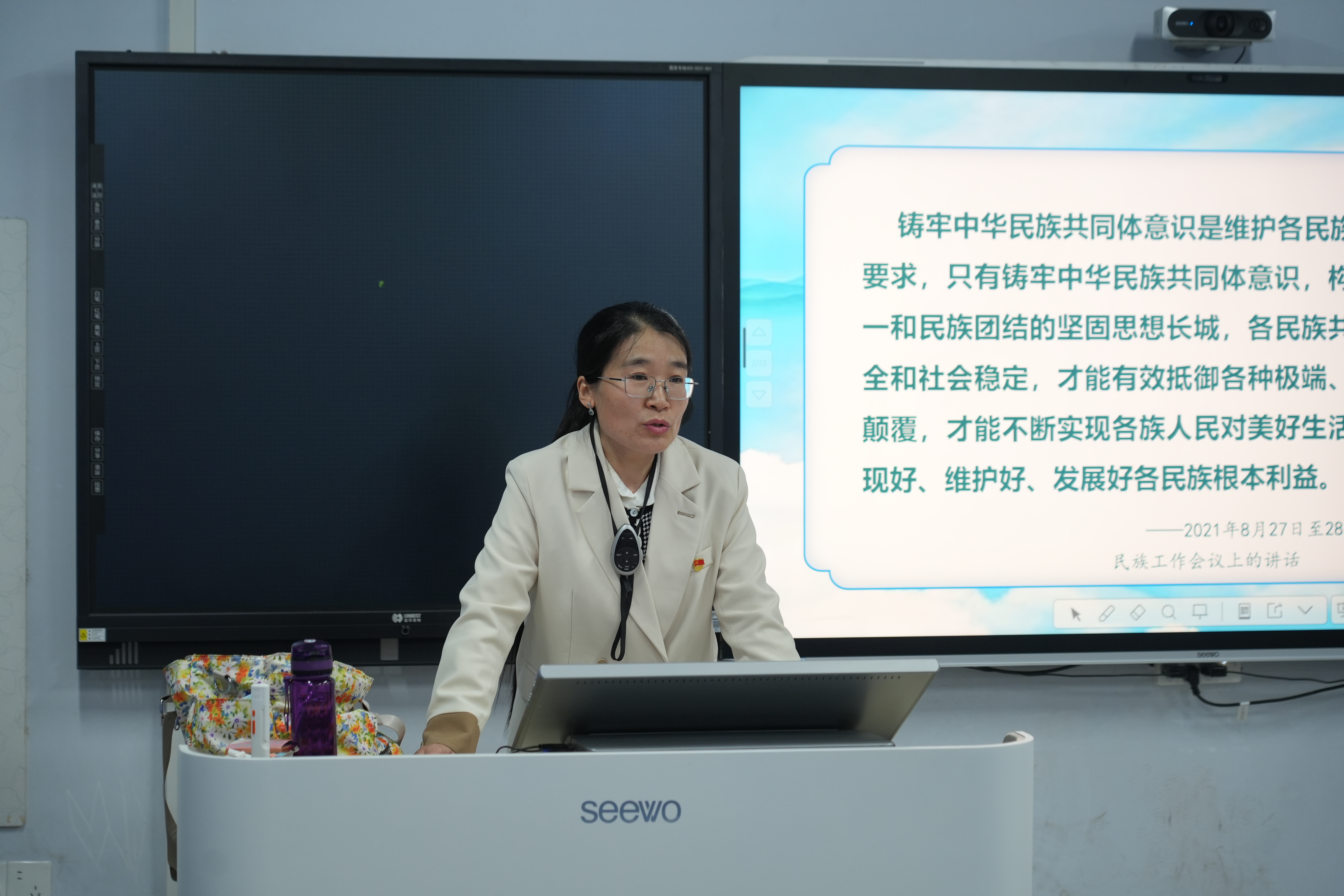 仪式结束后,马克思主义学院崔小莉教授以“铸牢中华民族共同体意识”为题,为培训班学员开启了本期培训的首次专题讲座。她先全面阐释了中华民族形成发展的基本原理,分析当前民族问题的复杂性与现实挑战,提出促进各民族广泛交流交往的策略。再结合生动事例,阐明铸牢中华民族共同体意识的重要性,解读其深邃内涵。最后她号召新时代青年要树立正确历史观、把握中华文明的“五个”突出特性,在各民族交往交流交融中铸牢中华民族共同体意识,为中华民族伟大复兴贡献力量。