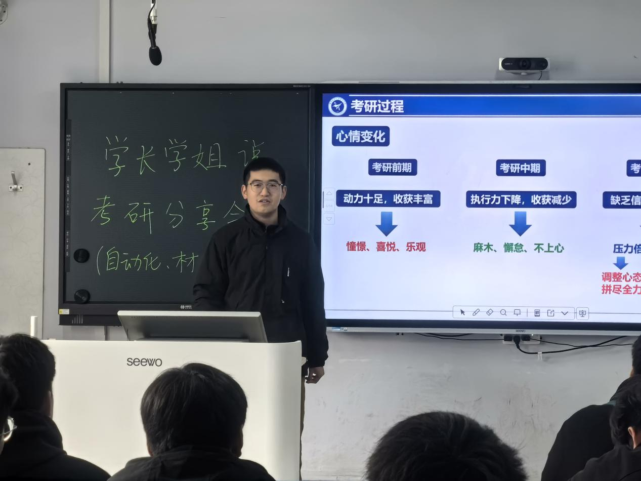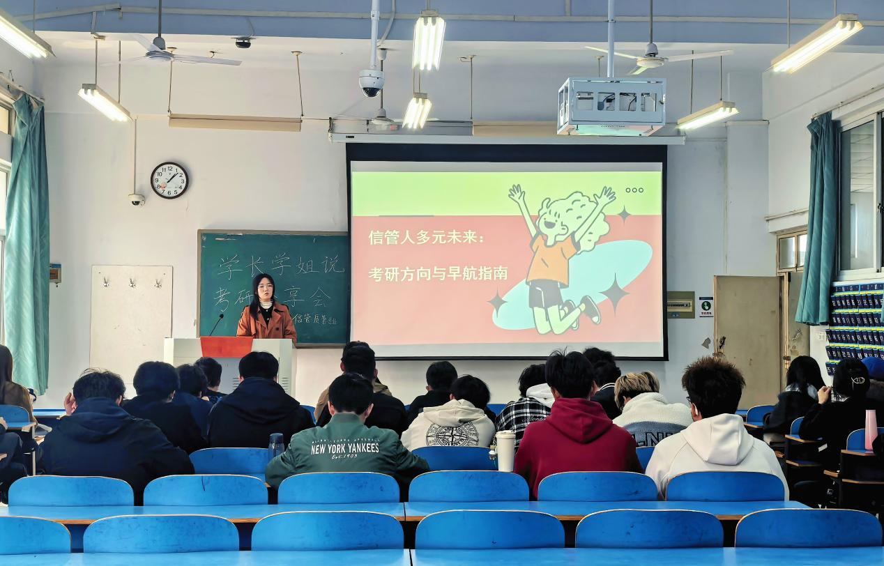 10月29日,我院 “学长学姐说” 考研经验分享会在 07A202、07A302 教室顺利举办。本次分享会邀请了2021级毕业生代表肖博元、高翼舒、郭星宇、王岩作考研经验分享,旨在为我院有考研意向的学生解答备考疑惑、明确备考思路、传授学习方法,我院2024 级百余名同学到场参与,现场气氛融洽,互动交流频繁。
