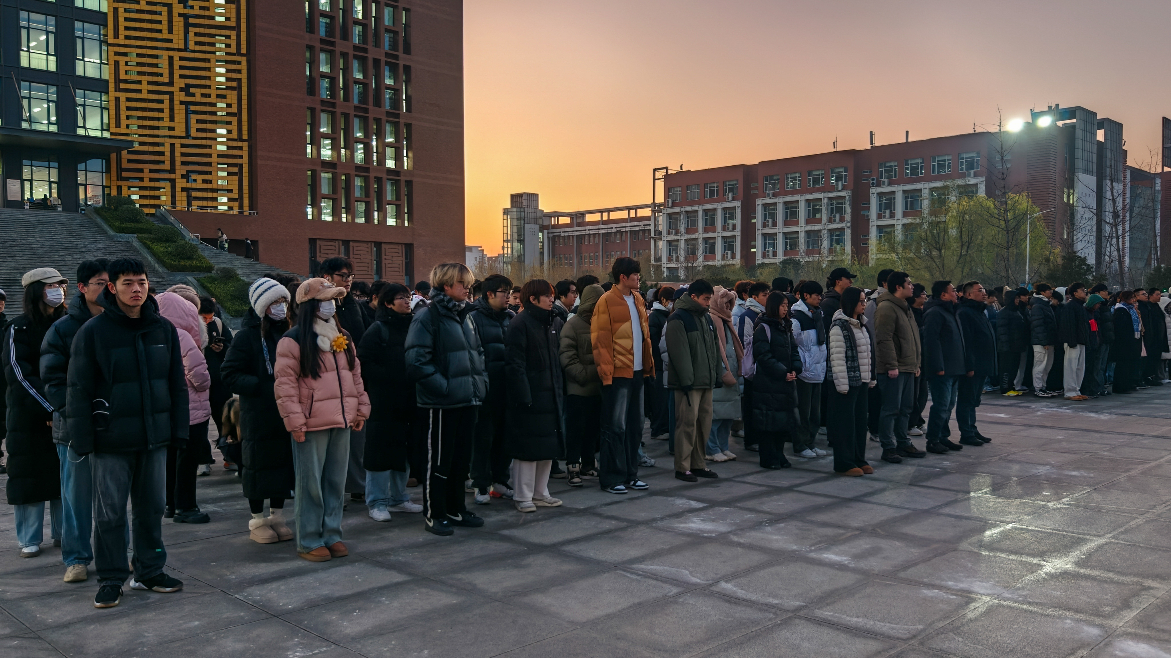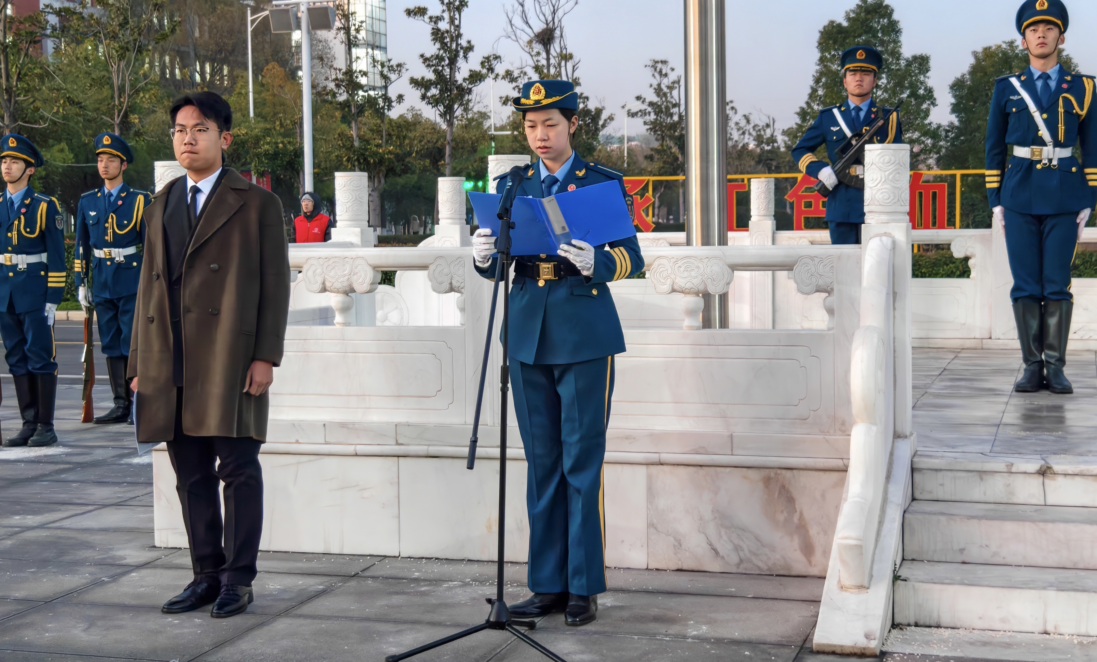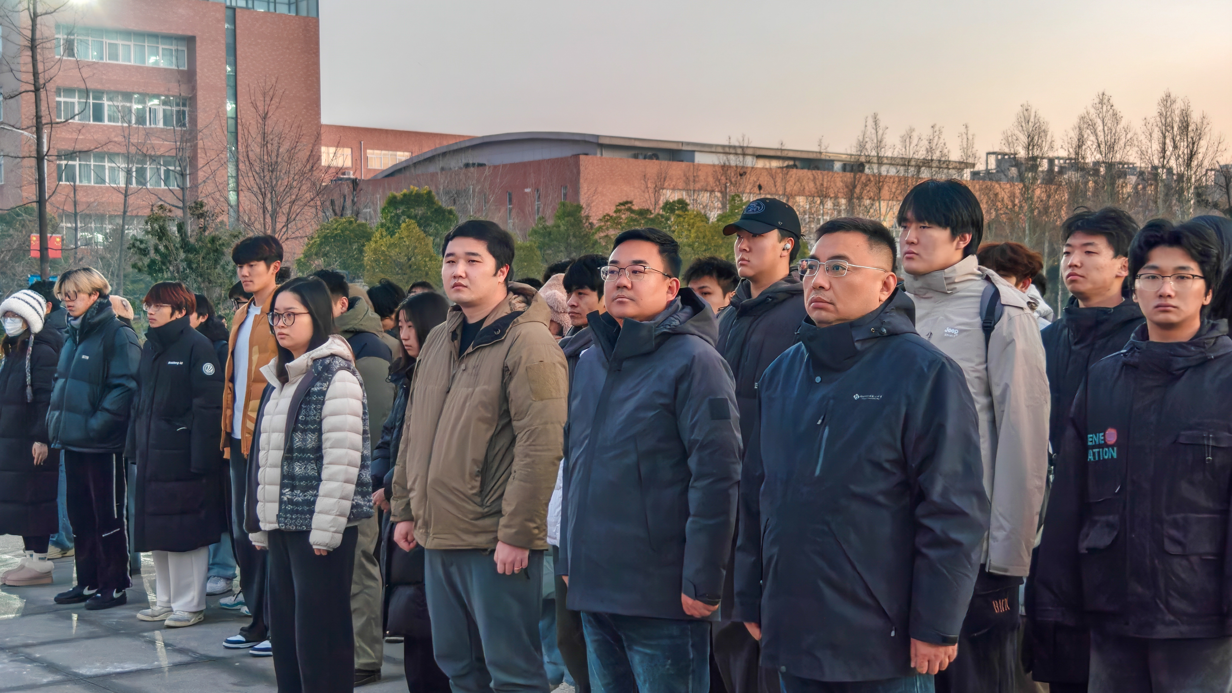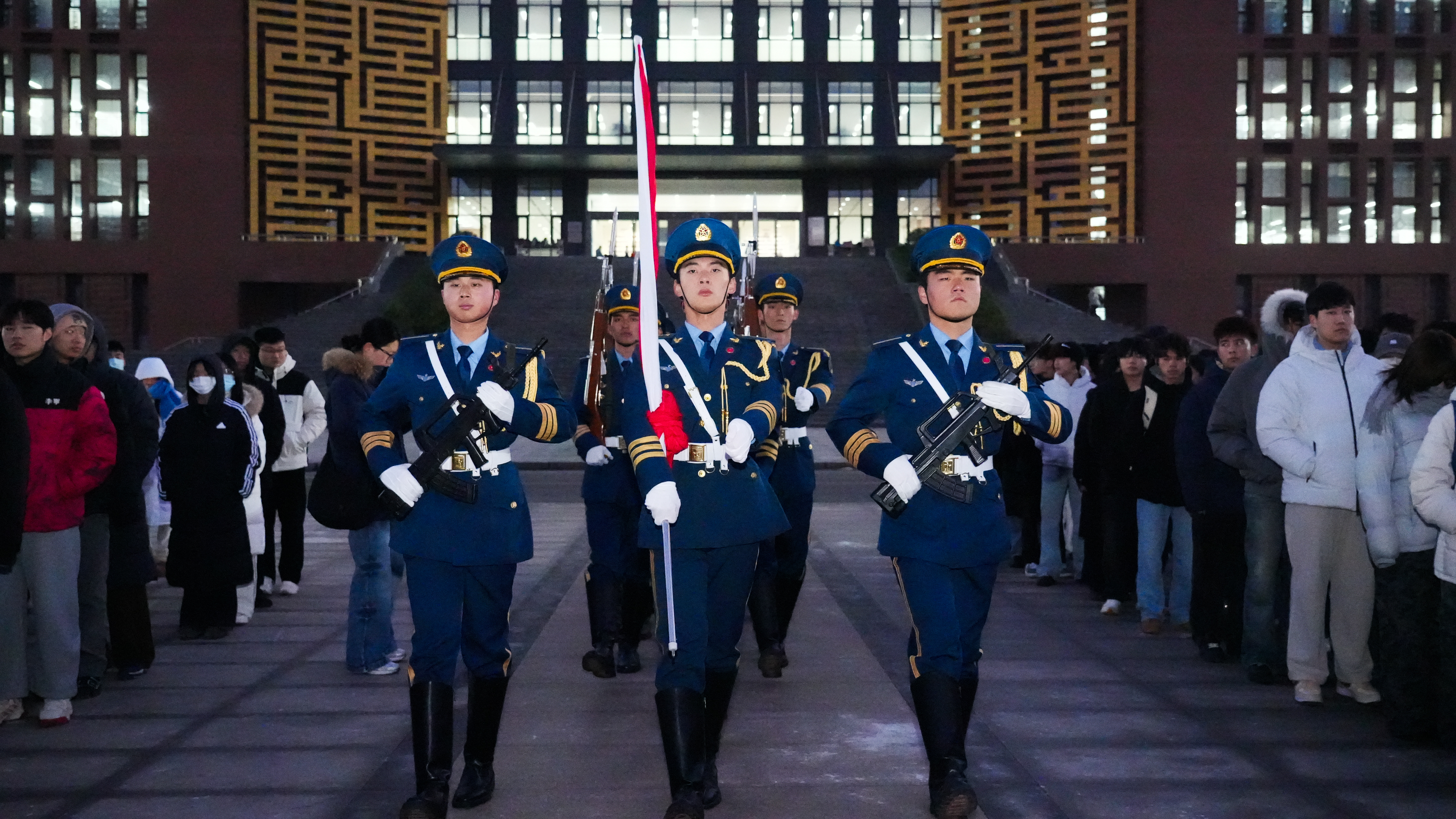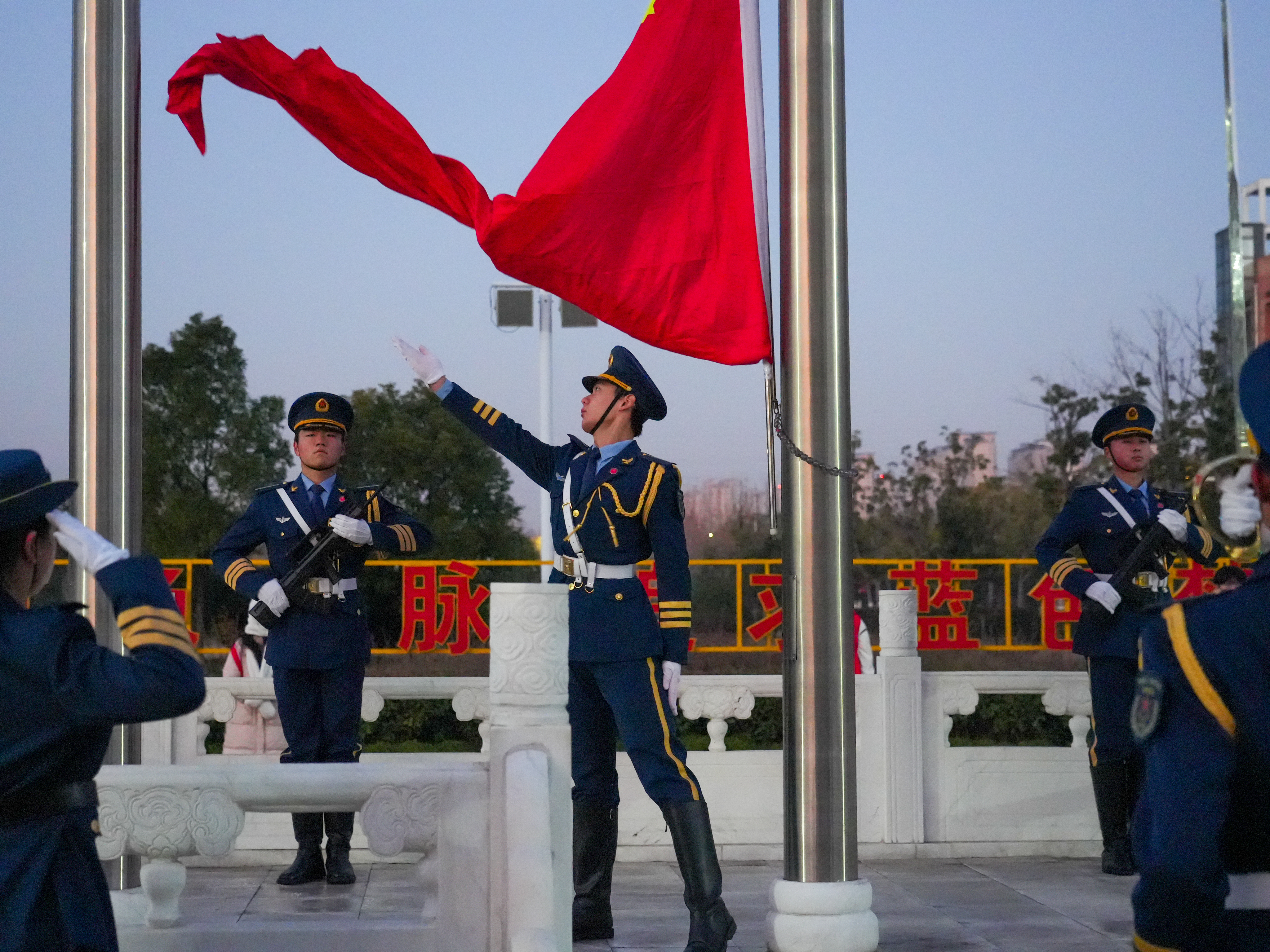 清晨寒风凛冽,却抵挡不住师生的满腔热情。国旗护卫队步伐铿锵,护送国旗入场。在庄严的国歌声中,鲜艳的五星红旗冉冉升起,全体师生肃立,行注目礼,浓厚的爱国情怀在心中激荡。