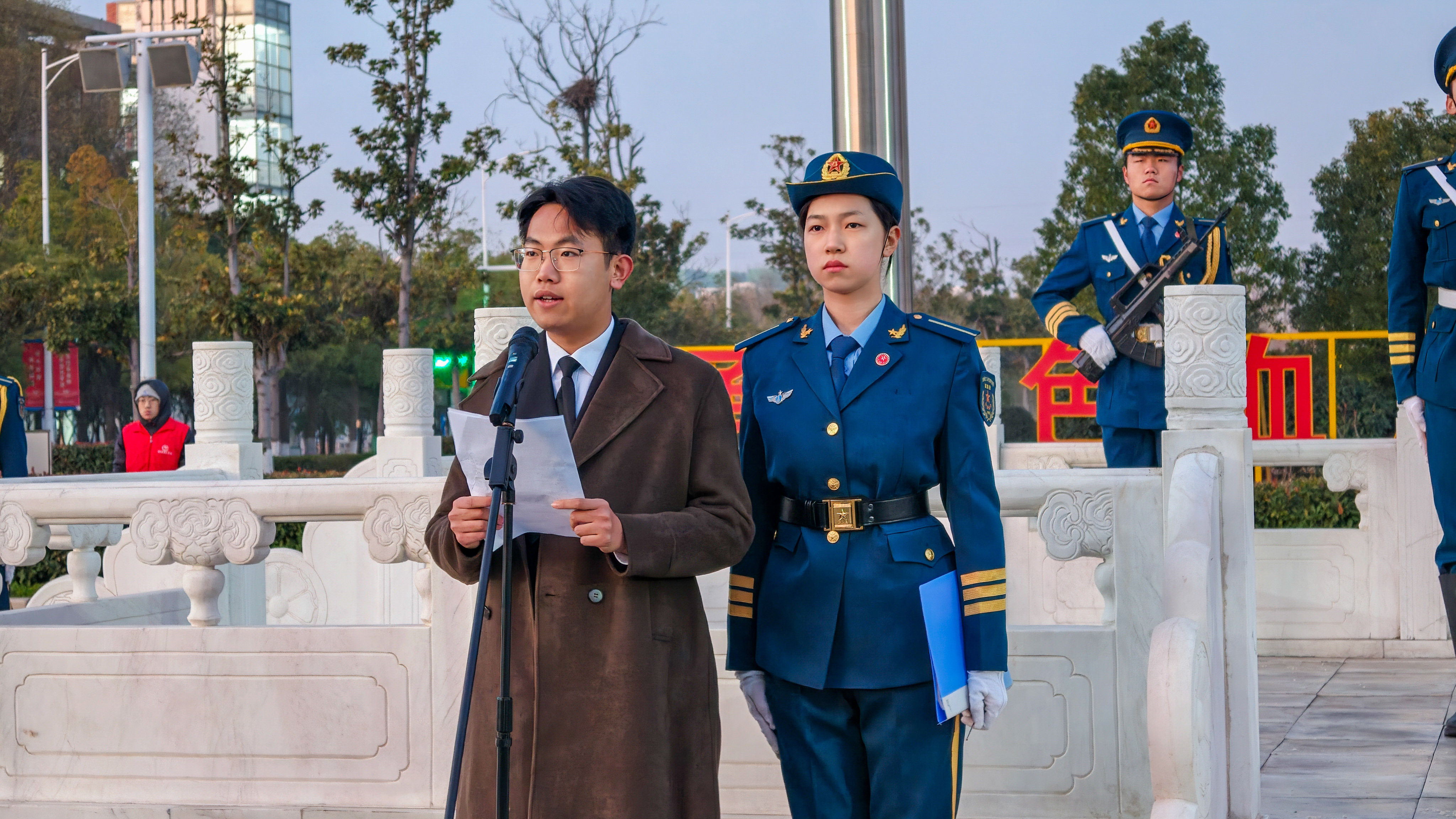 升旗仪式后,2025级信息管理与信息系统1班伦若轩同学作了题为《青春赴新程、奋进新时代》的主题宣讲。他结合“一二·九”运动的光辉历史,深情回顾了在中国共产党领导下,一代代青年为民族独立、人民解放和国家富强前赴后继的奋斗历程。他号召全体同学要铭记历史,继承和发扬爱国主义光荣传统,将个人理想融入国家发展和民族复兴的伟大事业中,以新时代好青年应有的姿态,奋进新征程,诠释新使命,创造新业绩。