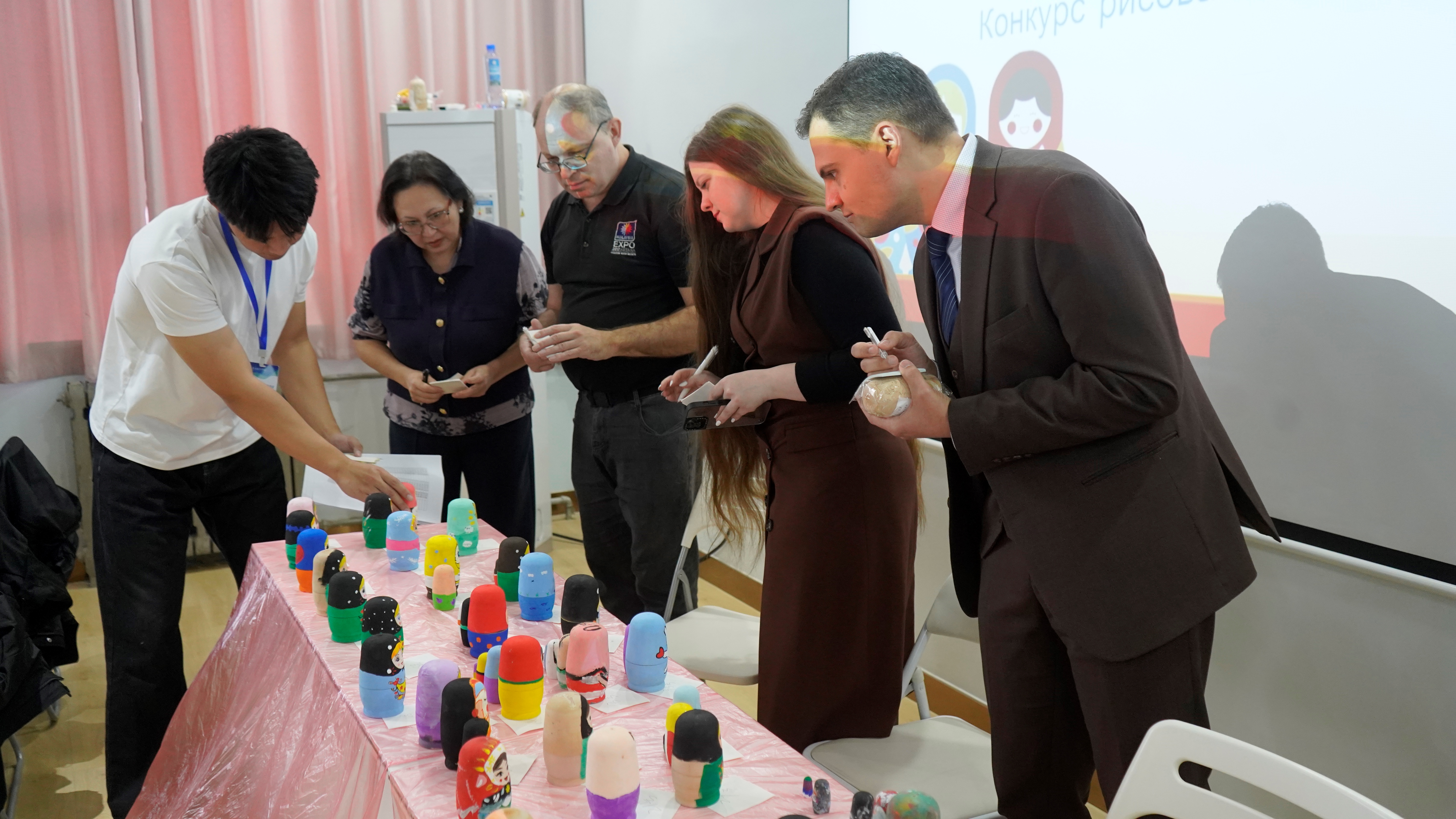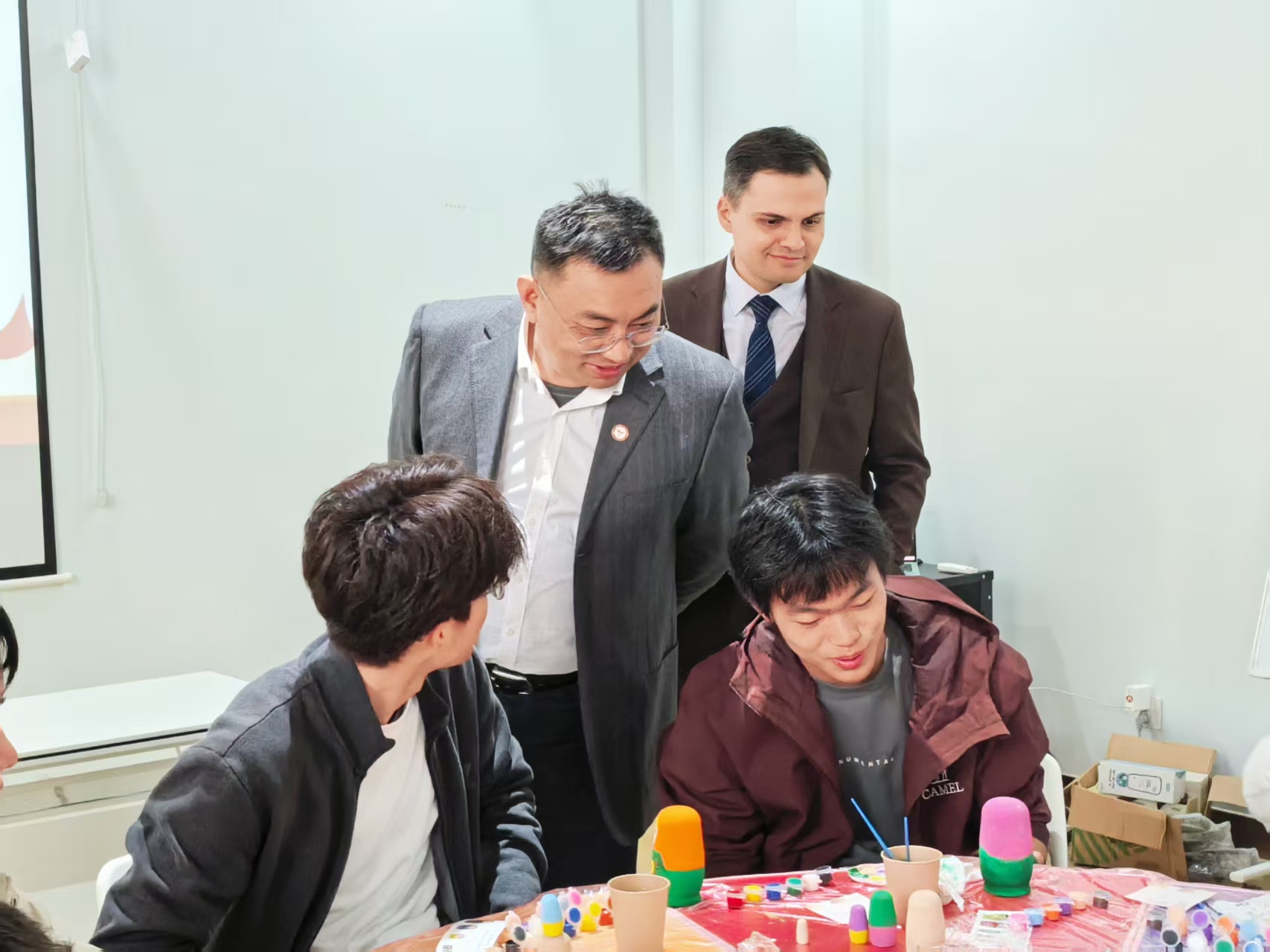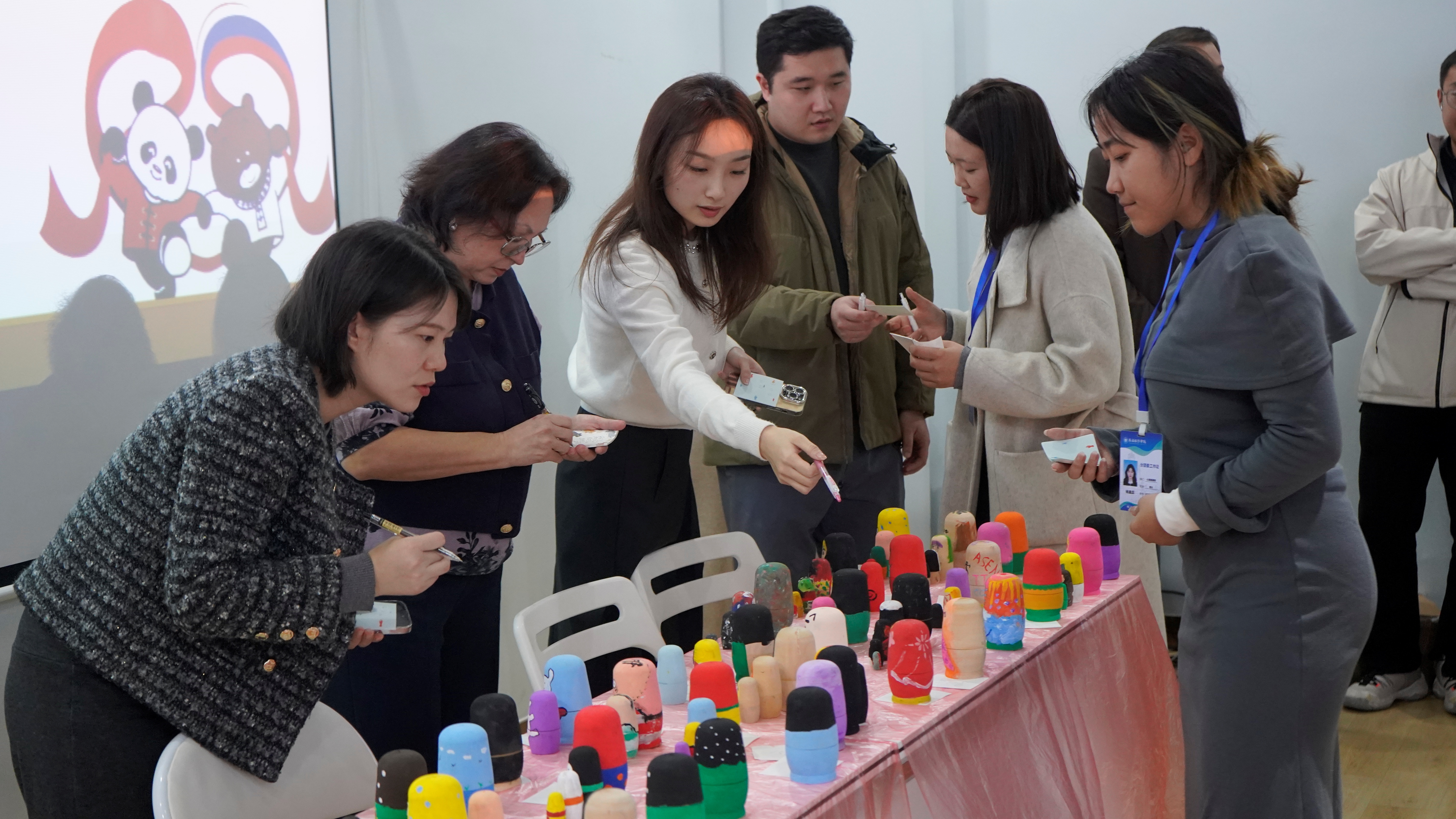 从色彩的精心搭配,到纹样的细腻勾勒,再到整体的意境营造,每一笔都凝聚着同学们的巧思与情感。在创作过程中,卡通形象与民族纹样巧妙碰撞,中华文化元素与俄式美学交相辉映,为传统套娃注入了崭新的生命力。外教亚历山大表示:这是一场非常有趣的活动,中国学子将中俄文化元素与个人创意进行了绝佳融合!“每一笔色彩,都是情绪的释放;每一个图案,都是内心的映照。”活动现场,一位参与者分享道。这种将中华文化元素与俄罗斯套娃相结合的艺术形式,不仅是一次跨文化体验,更成为同学们表达情感、梳理心绪的独特渠道。