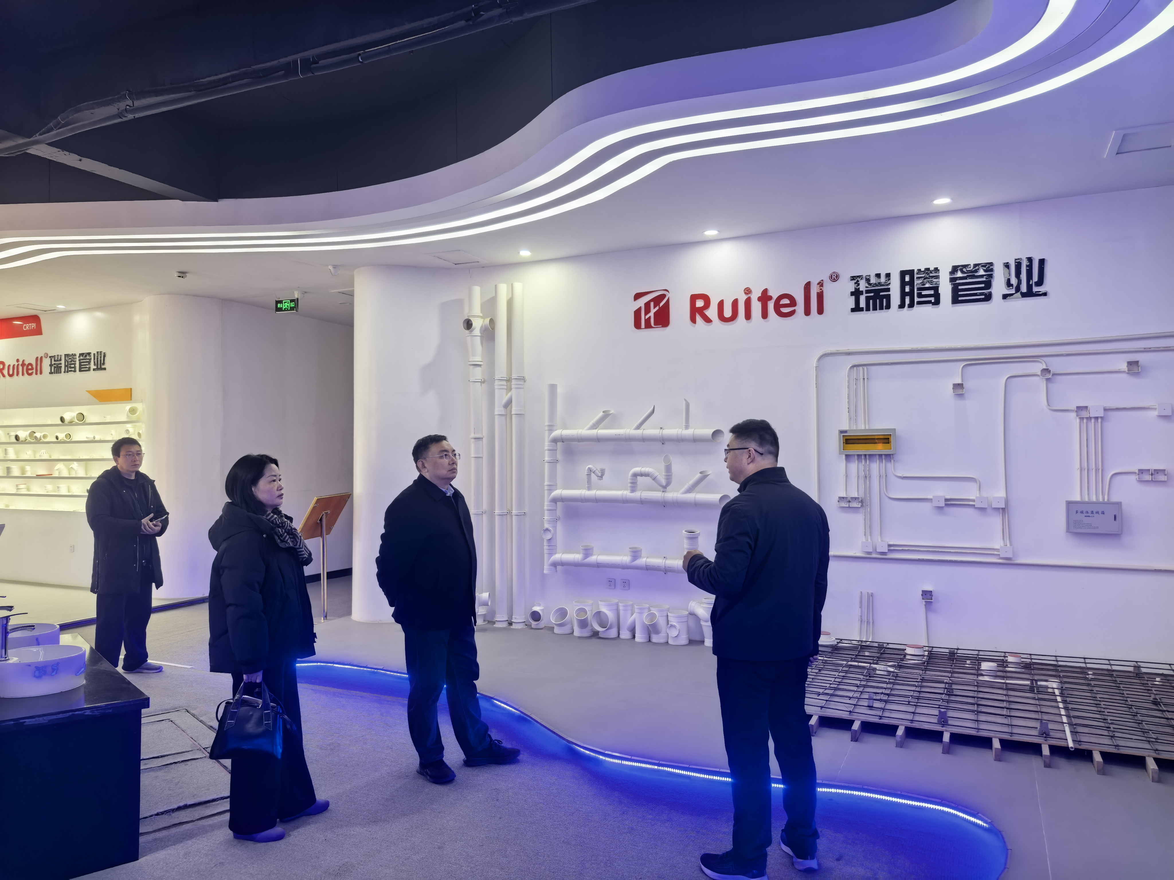 在徐瑞的引领下,学院一行参观了瑞腾集团的展示区,详细了解了集团的发展历程、所获荣誉、企业理念及海外市场业务布局。徐瑞还系统介绍了集团各类产品结构与当前涉及的核心业务领域,展示了企业在技术创新与市场拓展方面的实力。