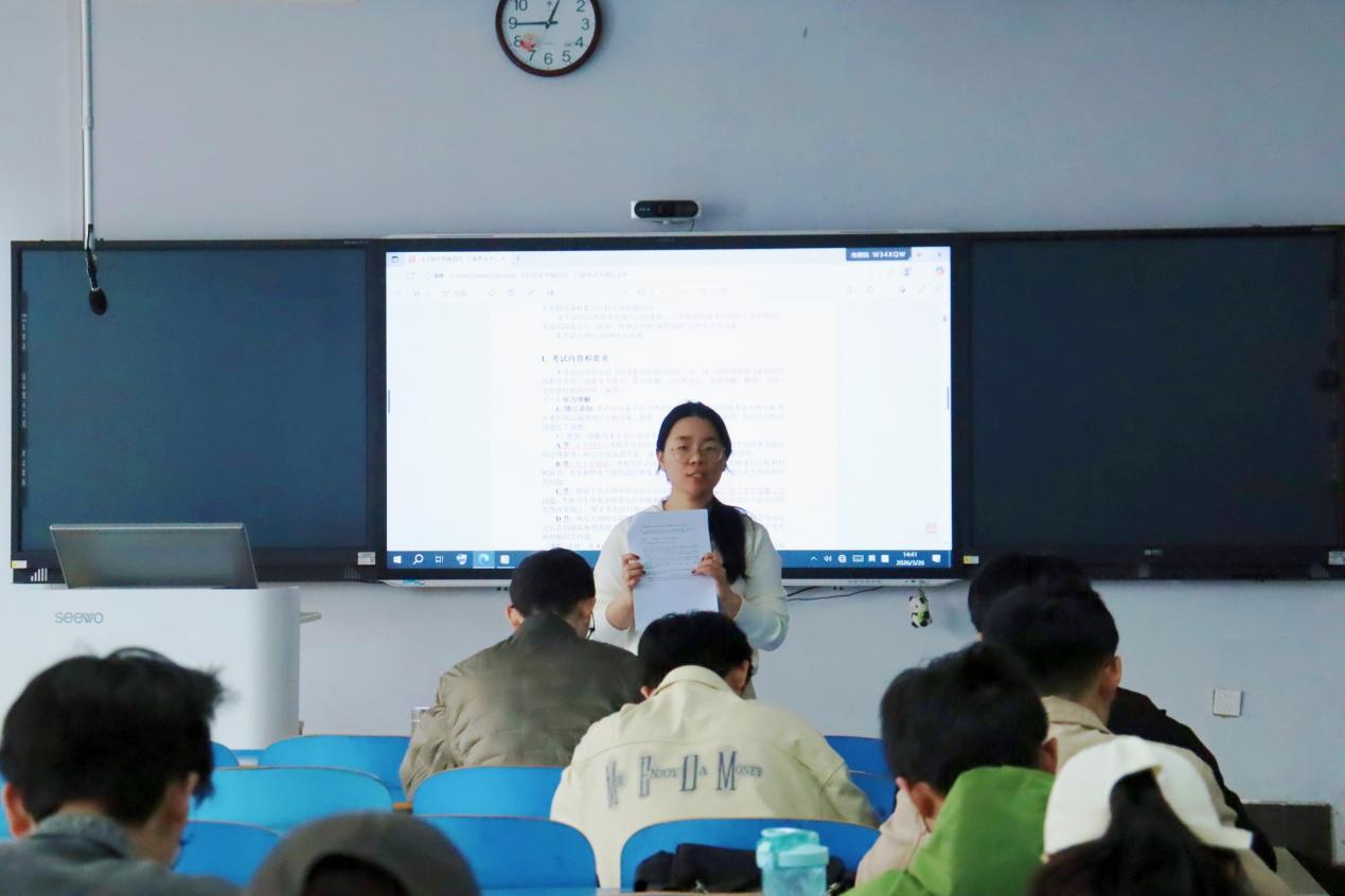 实战训练环节,张文静老师组织同学们开展听力例题专项练习,逐题拆解听力材料、讲解答题思路,引导大家快速熟悉听力考查特点与出题规律。针对听力部分易失分、难提升的问题,她分享了实用备考方法,提醒同学们坚持每日听力练习,循序渐进积累得分点。随后,老师还带领同学们开展其他题型的实战演练,传授审题技巧与答题规范,帮助大家及时纠正复习误区,切实提升应试能力。