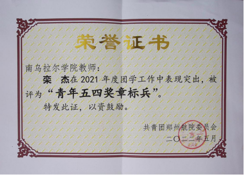 19.南乌拉尔学院教师栾杰荣获郑州航院青年五四奖章标兵。