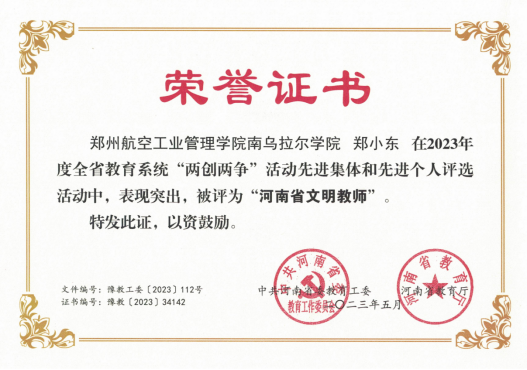 23. 南乌拉尔学院教师郑小东荣获“河南省文明教师”称号。